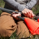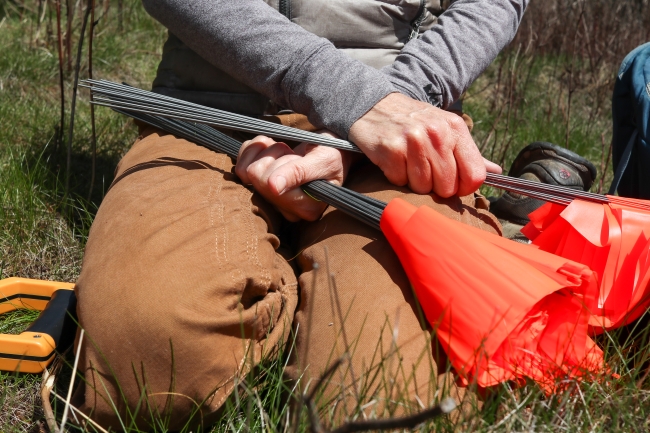 Sue Cameron holding flags to be used to mark where young red spruce trees are to be planted in the Camp Alice area of Mount Mitchell State Park, Yancey County, NC.
