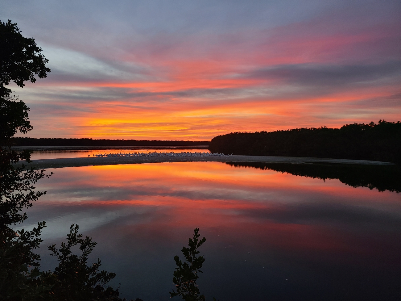 Vivid sunset behind a large flock of American White Pelicans at Water Control Structure 5 located on the Wildlife Drive at J.N. "Ding" Darling National Wildlife Refuge in Florida.