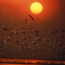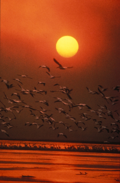 Sunset view of white pelicans