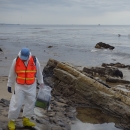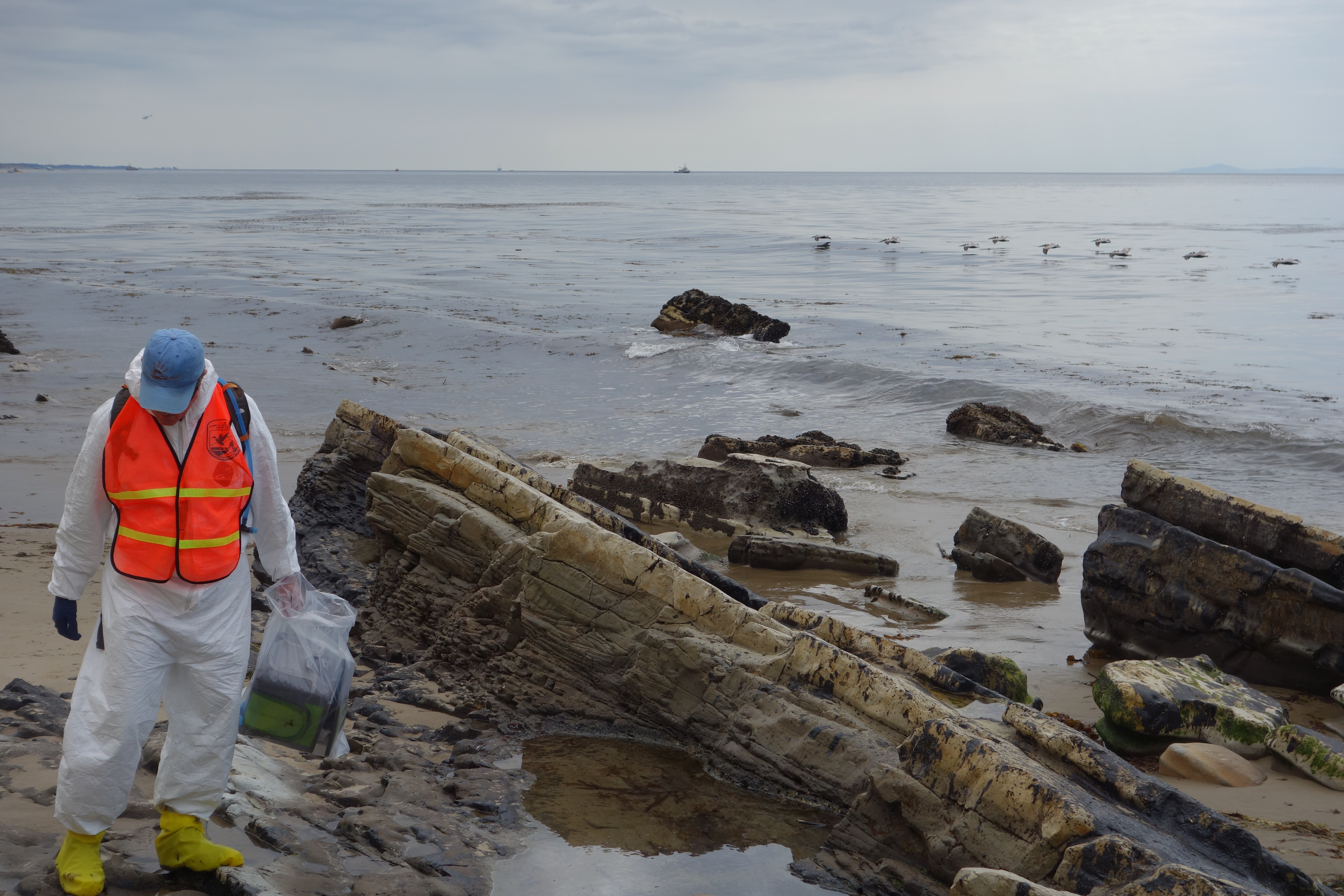 U.S. Fish and Wildlife Service biologist documents wildlife impacts at Refugio State Beach in the early days of the Refugio oil spill as a flock of California brown pelicans skim the water in the background.