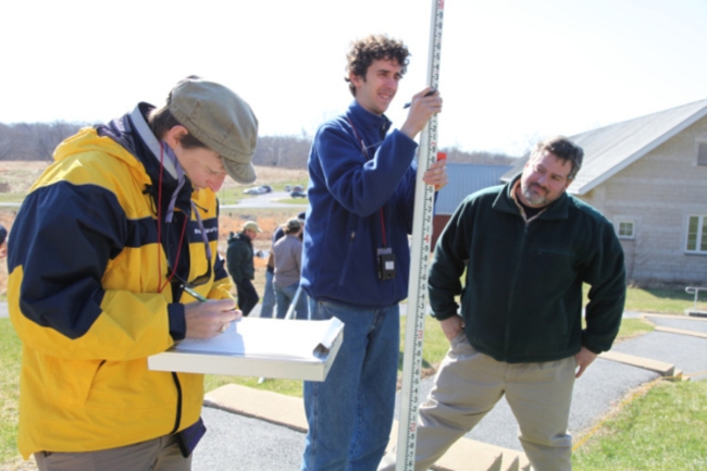 Students attending the FIS3200 Stream Habitat Measurement Techniques course at the U.S. Fish and Wildlife Service's National Conservation Training Center, practice using a surveyor's rod for mapping profiles of various habitat features.