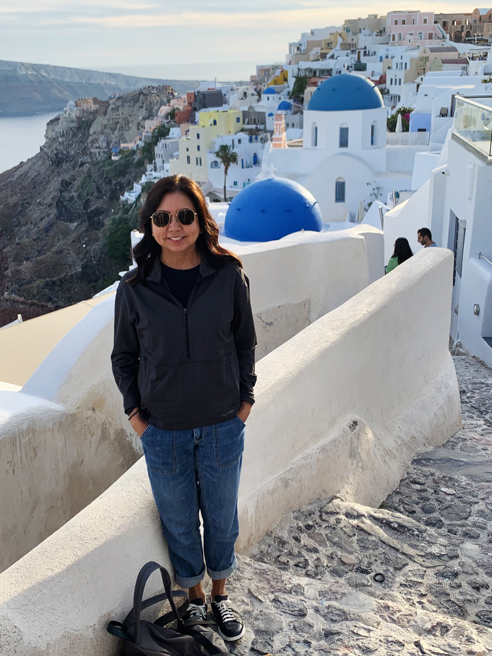 Susan Machida pictured among the landscape of Santorini, Greece, May 2023. Photo by Machida ‘ohana.