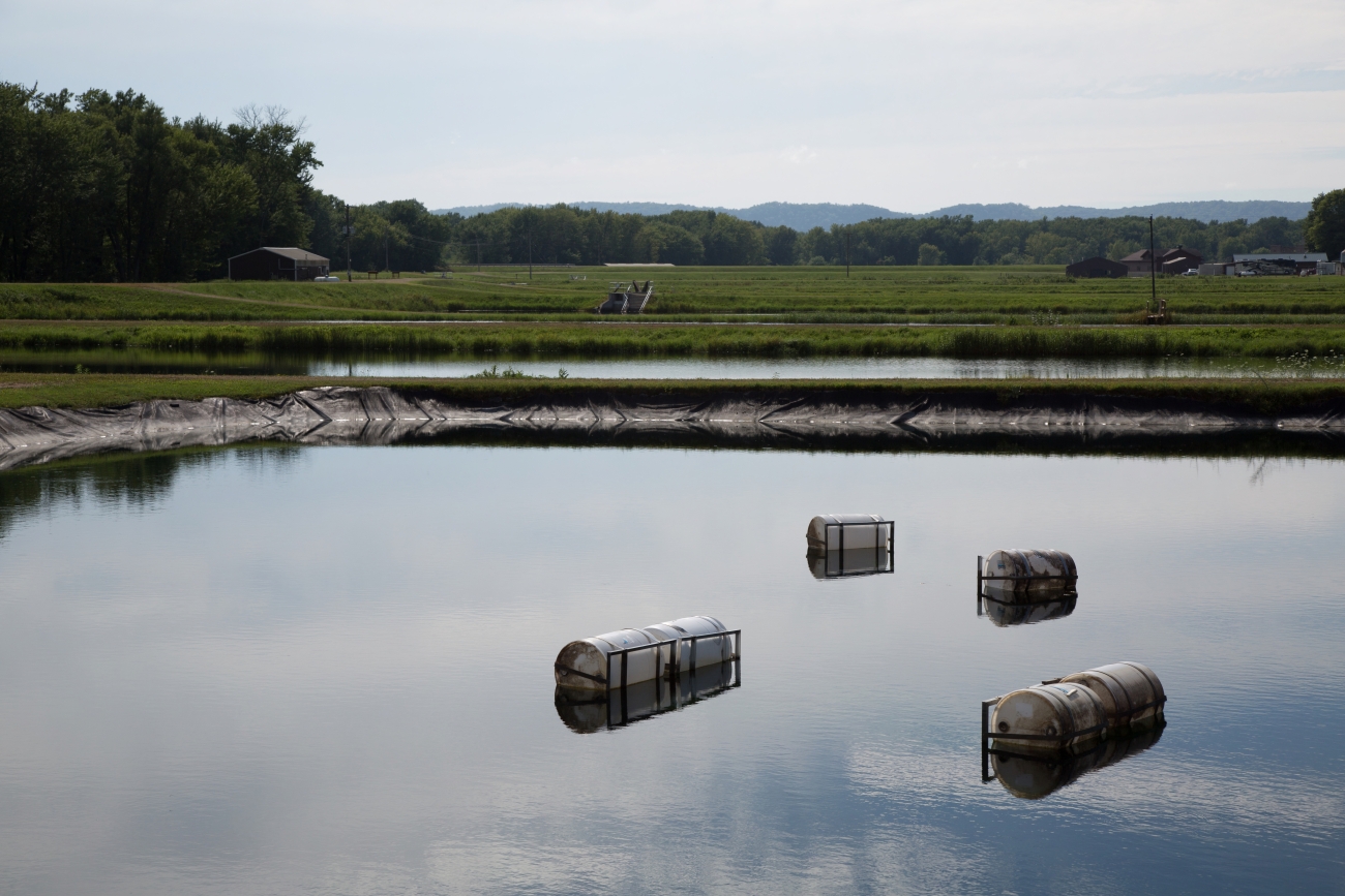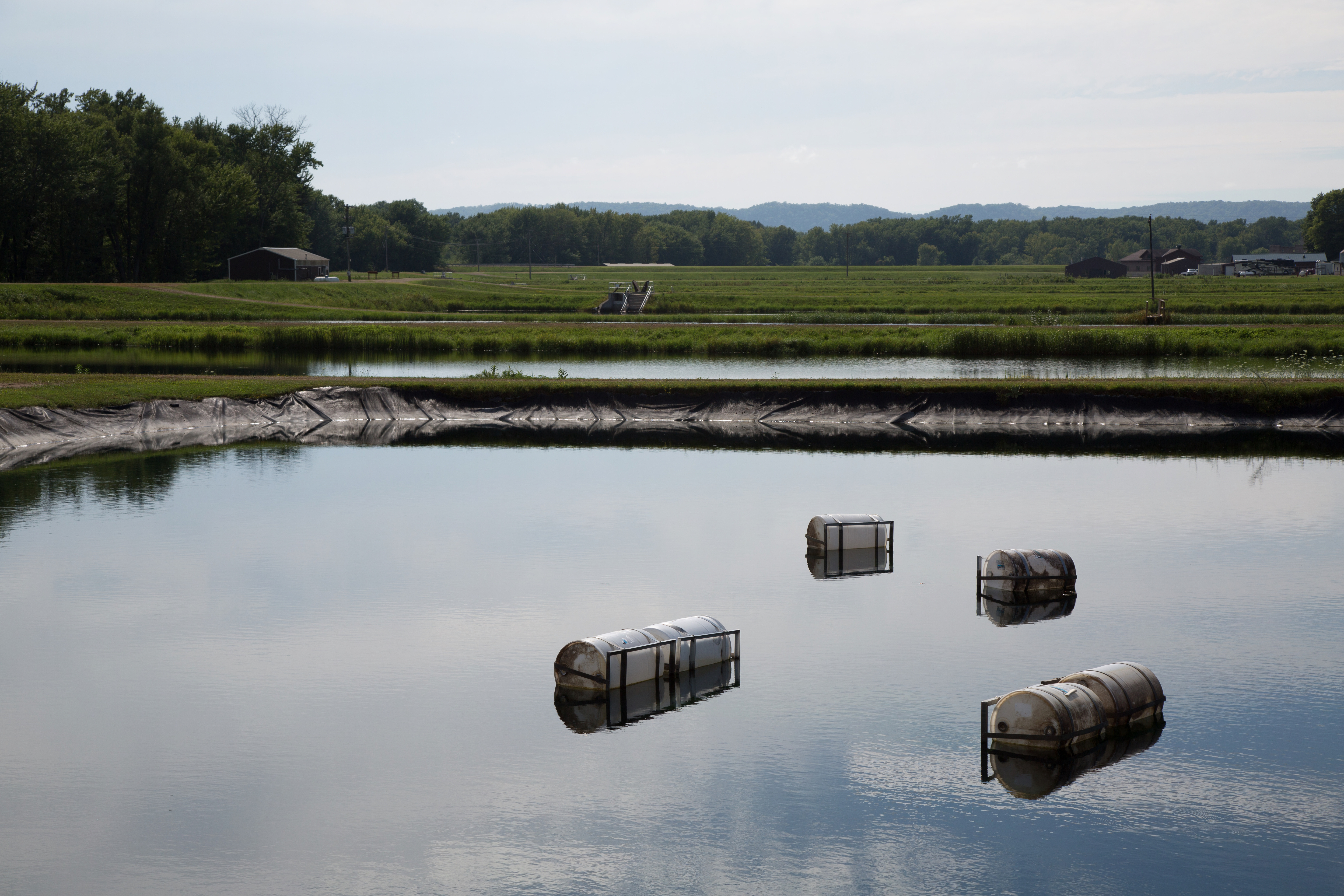 Fish ponds at Genoa National Fish Hatchery. These ponds are being used to rear freshwater mussels. There are cages containing mussels which are suspended above the bottom using floats and frames.