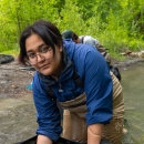 Service intern, Suzena Arias, holding a bull trout she captured and sampled on the Dungeness River.
