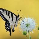 A western tiger swallowtail butterfly (Papilio rutulus) feeding on a buttonwillow flower (Cephalanthus occidentalis californica) American River Parkway, Sacramento, California