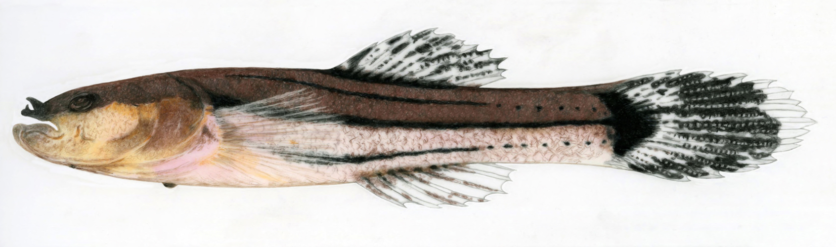 Illustration representative of species group for fish identification. The Swampfish, Chologaster cornuta, near vegetation and debris in swamps, sloughs, and quiet pools or backwaters of creeks.