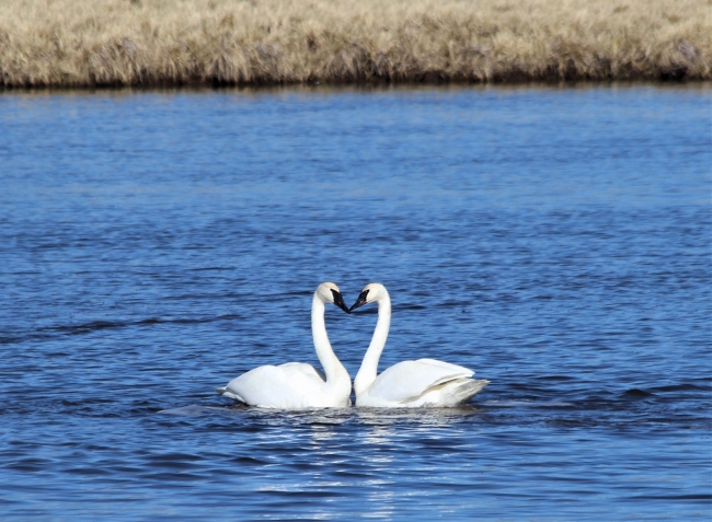 A pair of trumpeter swans on Red Rock Lakes National Wildlife Refuge's Lower Red Rock Lake show affection and form a heart shape as the pair strengthens their bond. Photo by Cortez Rohr/USFWS.