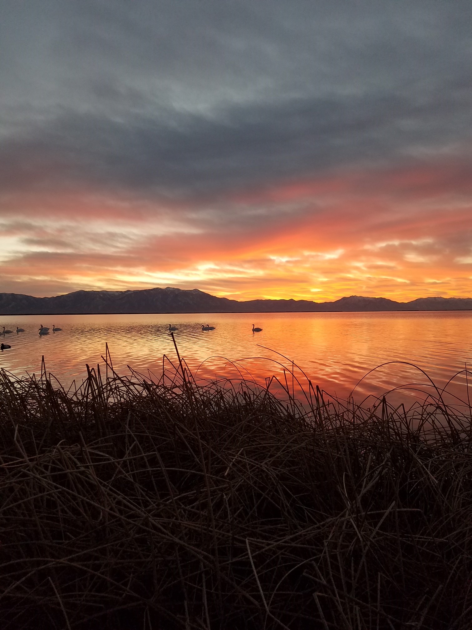 Swans at sunset at Bear River Migratory Bird Refuge