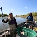 Heather Swinney and Austin Demarest look for white sturgeon to tag in the San Joaquin River on April 12 near Manteca, California. The team anchored four 12-foot-tall nets to the river bottom and to the shoreline about 100 feet away to catch sturgeon, the largest freshwater fish in North America.