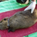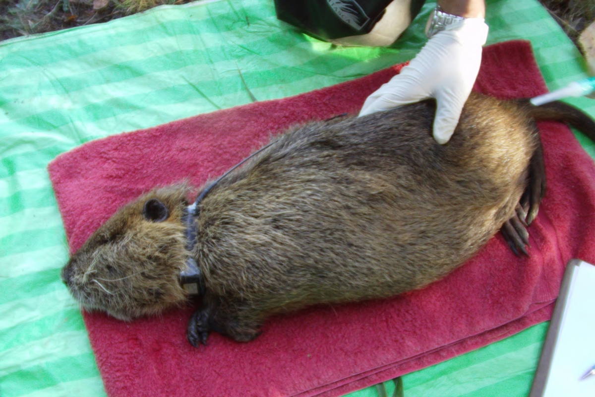 A collar is successfully attached to the nutria on the Tuatalin River National Wildlife Refuge. Tagging the animals will help biologists to better understand the nutria and to prevent their spreading.