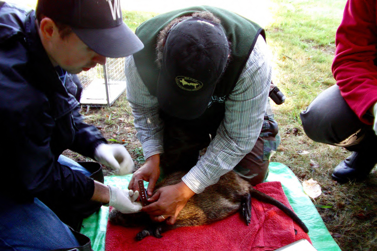 The U.S. Fish and Wildlife Service does studies to find out how these animals affect habitat and other species. Biologists adjust the collar on this nutria prior to releasing him. Image taken from USFWS Pacific Region Flickr page.