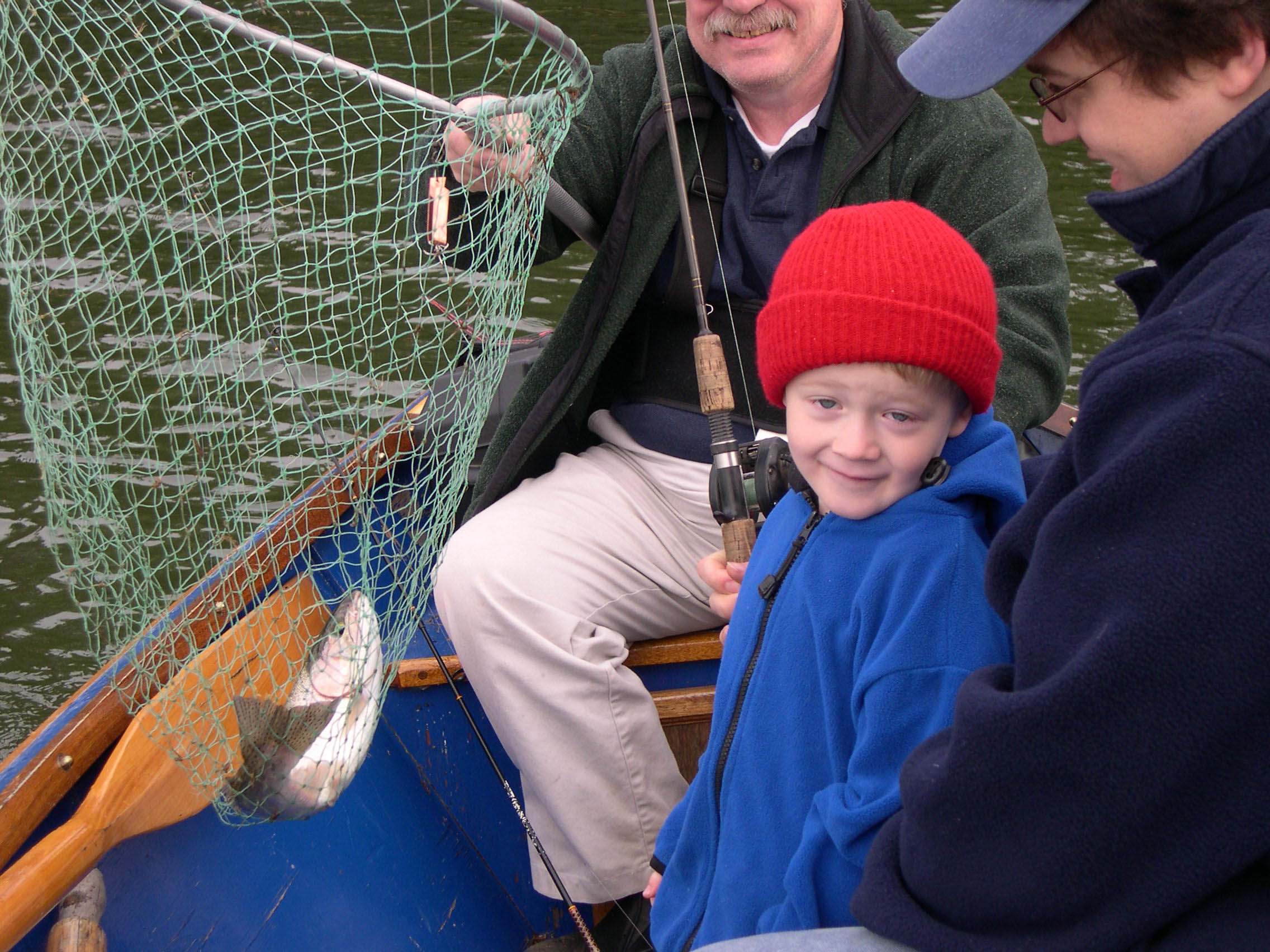 A four year old Alaska youth poses with his first fish. The 17 inch rainbow give him quite a time as it made several long runs, jumped a foot or more into the air many times and then dove for the bottom. The youngster still talks of the fish and remembers