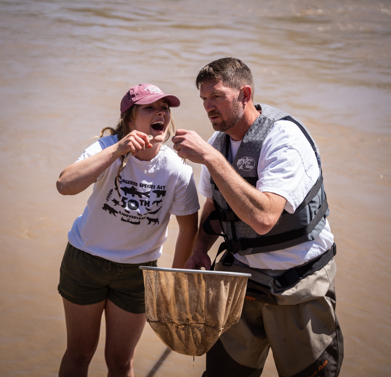 Teacher Patrick Steele and his daughter kissing razorback sucker goodbye.