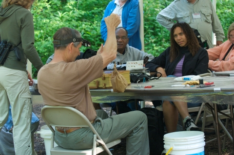 Teacher showing class how to weigh bird captured for banding by using scales and placing bird in paper bag; image taken during National Conservation Training Center course OUT8163 Connecting People to Nature Through Birds.