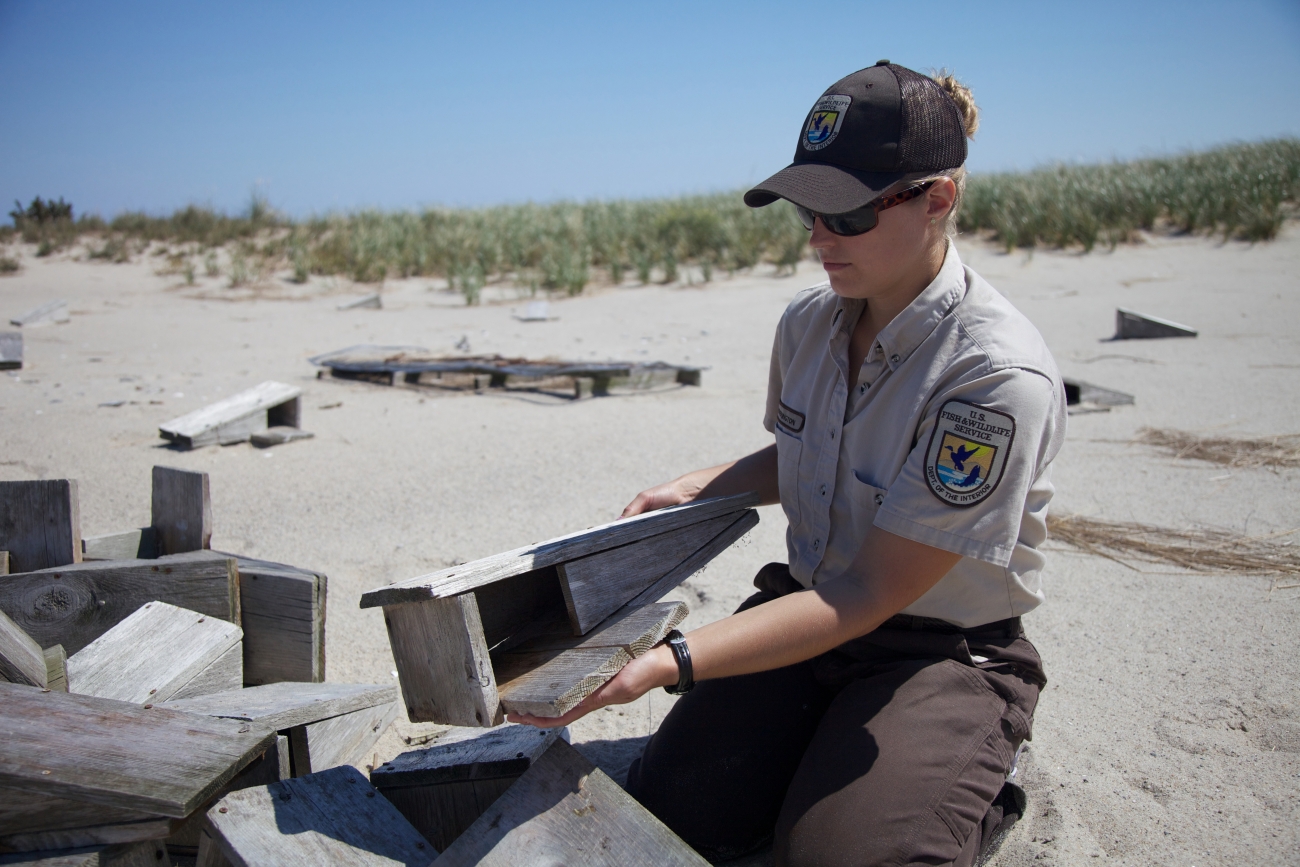 USFWS employee setting out tern nesting boxes along the dunes.