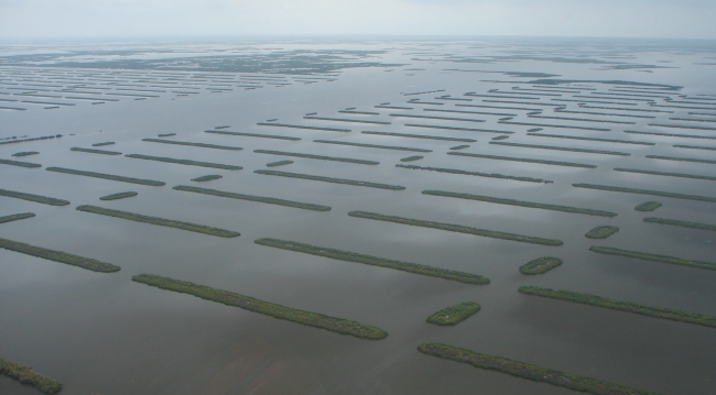 Coastal restoration by creating terraces to reduce wetland loss and create habitat for hurricane protection and habitats for fish and wildlife species