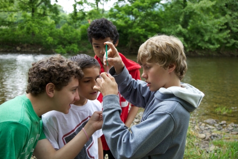 School children test water quality chemistry/survey macroinvertebrates at Seneca Rocks, WV.