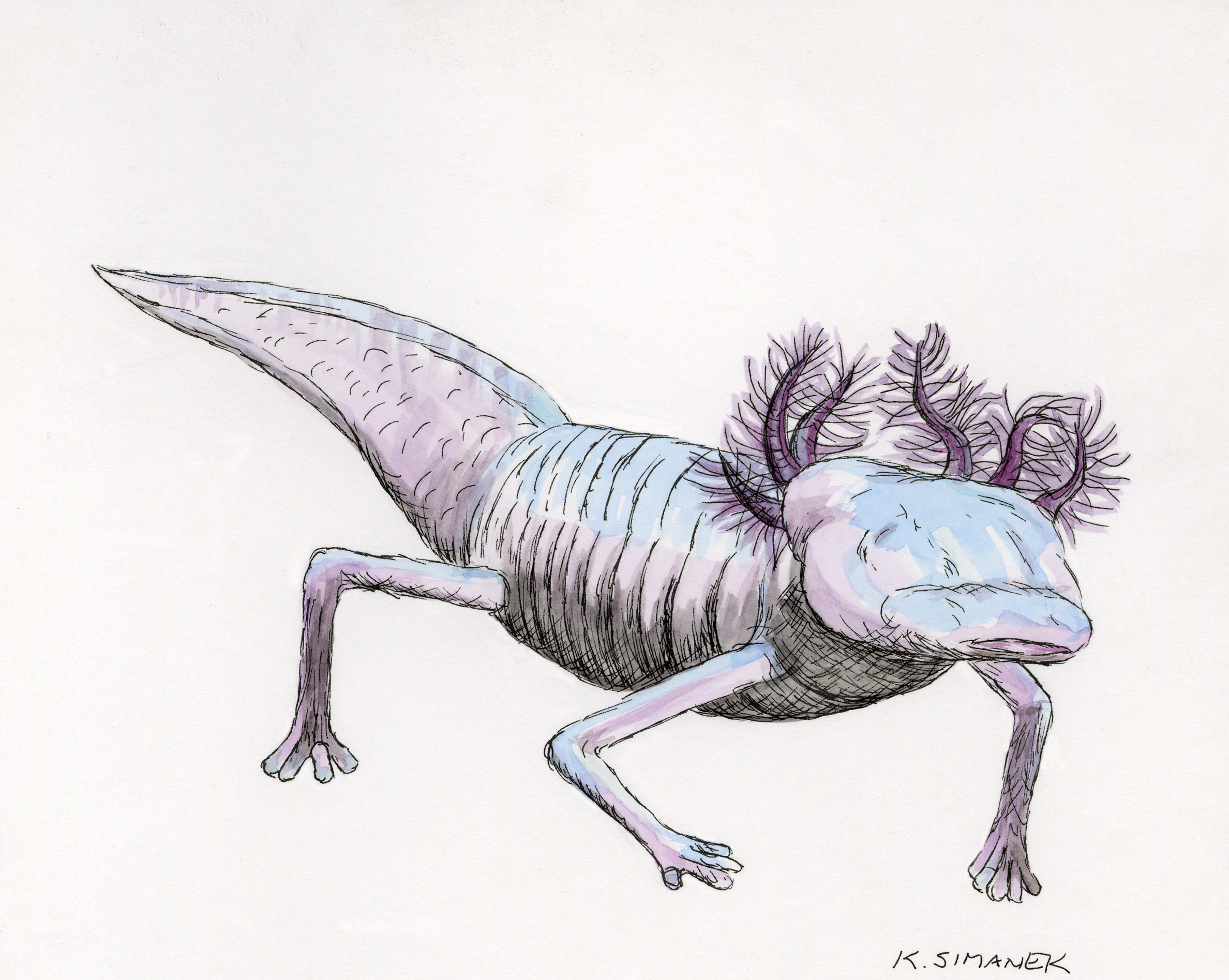Pen and watercolor illustration of a Texas blind salamander by USFWS artist Kristin Simanek.