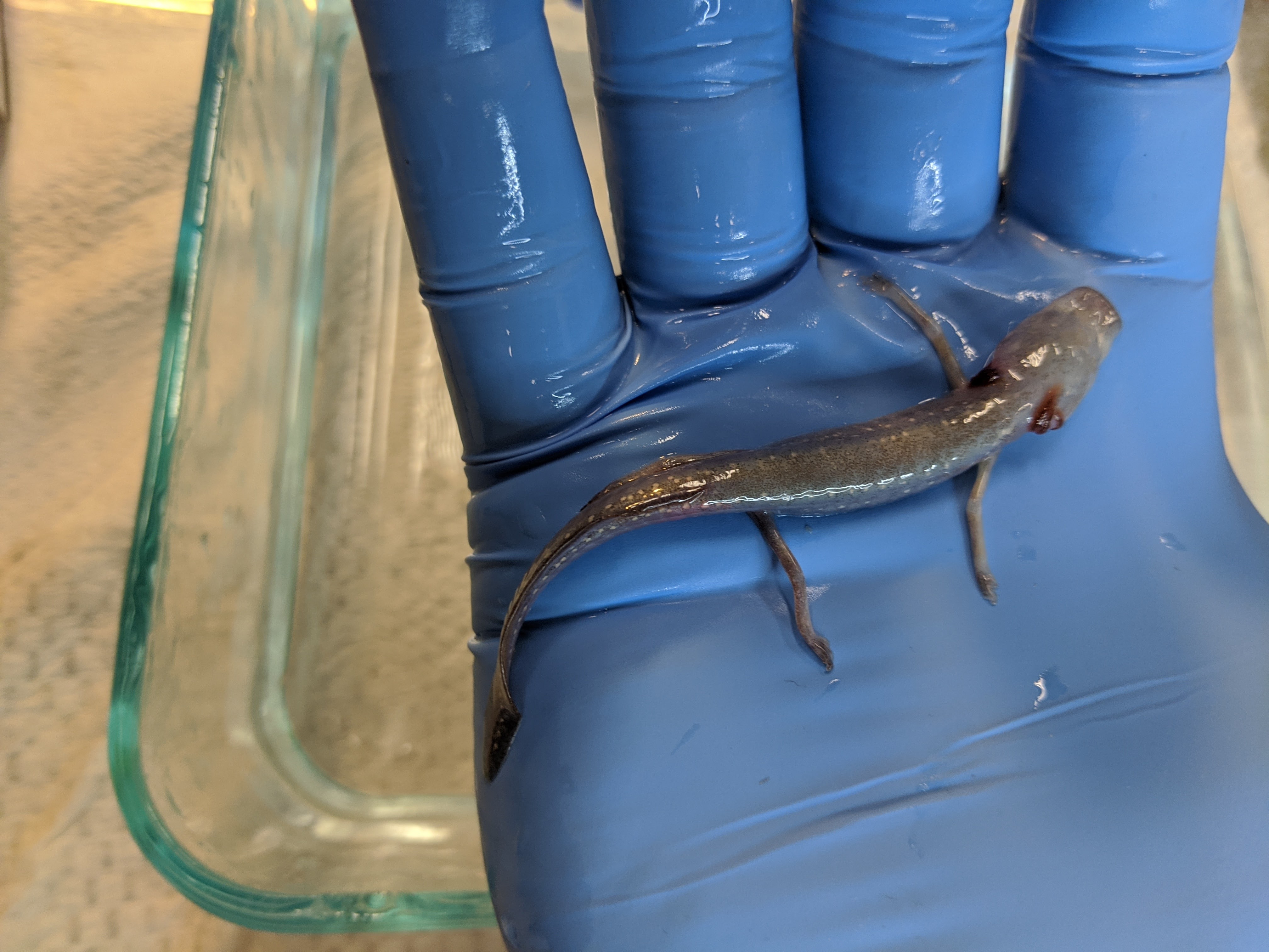 Texas blind salamander being examined at the San Marcos Aquatic Resources Center