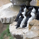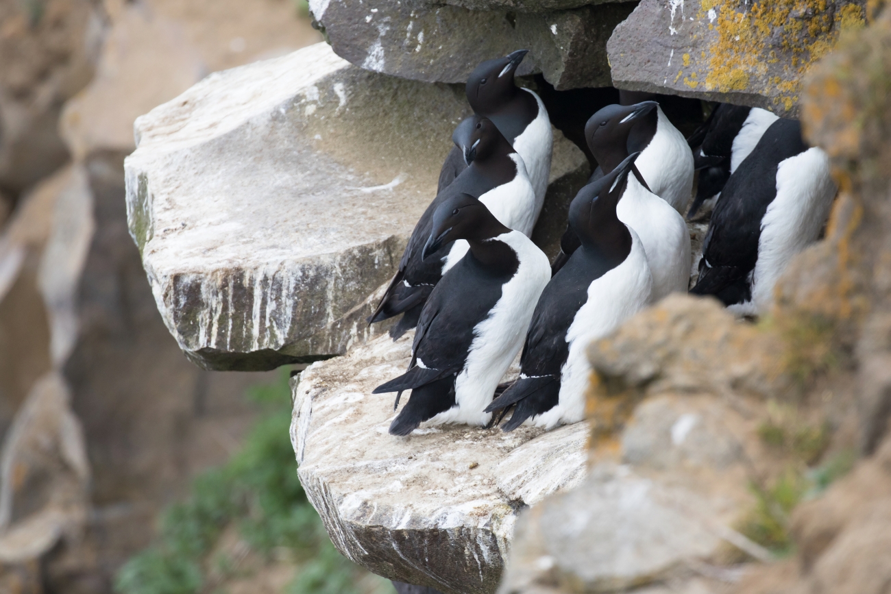 Several thick-billed murres on a rock ledge in the Pribilof Islands, Alaska.