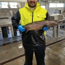 Thomas Johnson with a salmon during spawning at Makah National Fish Hatchery in Washington.