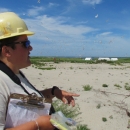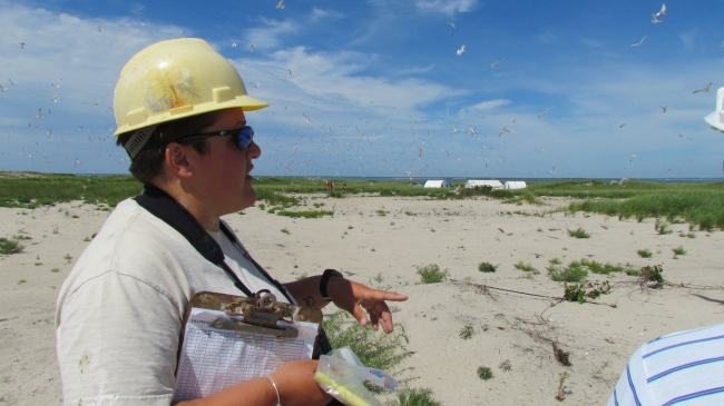 Thousands of terns fly over Monomoy NWR as Refuge Biologist, Kate Iaquinto, interprets the landscape by the Monomoy base camp on South Monomoy Island.