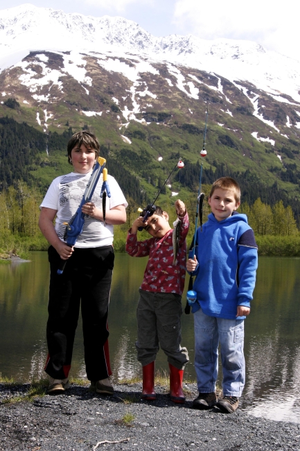Three children with fishing poles at Portage