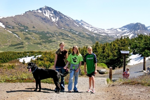 Three girls hike on Flattop Mountain, Anchorage, Alaska with their dog.