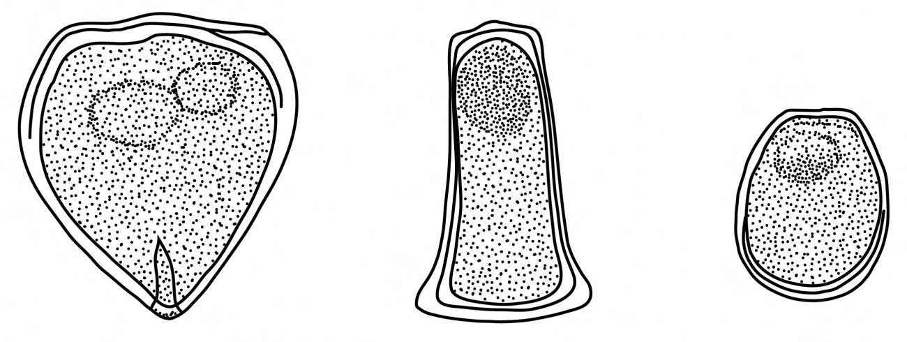 The three primary types of glochidia in the North American Unionidae. Subtriangular, hooked glochidia (left), axe-head glochidia (center), and semi-elliptical, hookless glochidia (right). Graphic: Kristin Simanek, USFWS.