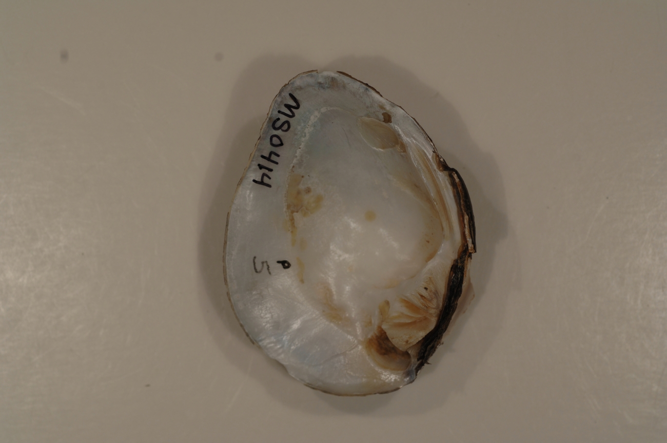 NCTC Freshwater Mussels Teaching Collection: Order: Unionoida Family: Unionidae Genus (ITIS): Obliquaria Species: reflexa (inside) Williams et al.: Use to be: Location Name: Location State: MS