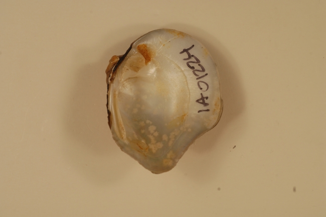 NCTC Freshwater Mussels Teaching Collection: Order: Unionoida Family: Unionidae Genus (ITIS): Obliquaria Species: reflexa (inside) Williams et al.: Use to be: Location Name: Mississippi River near Bettendorf Location State: IA