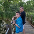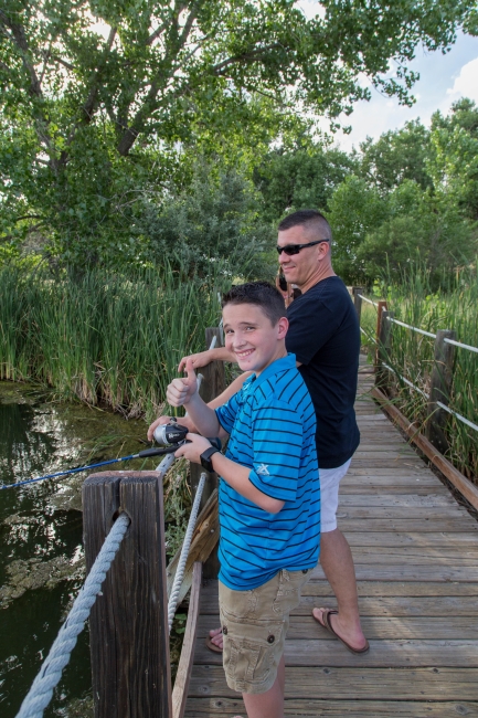 A young boy gives a thumbs ups while fishing with an adult male from a dock at the refuge.