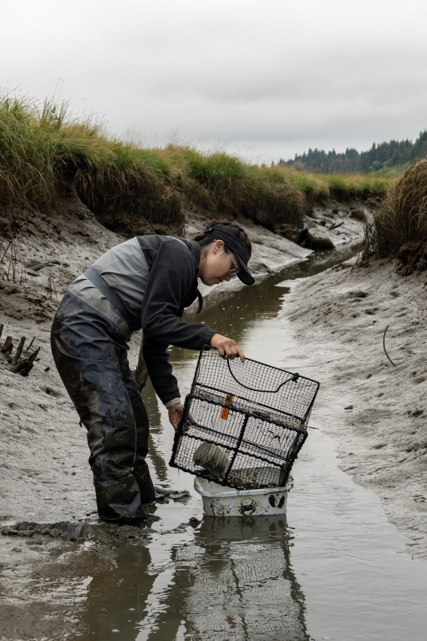 Bureau of Indian Affairs WaterCorps intern Maya Bass collects the crabs caught in a trap while surveying for the invasive European Green Crab at an estuary in Gray's Harbor, Washington.