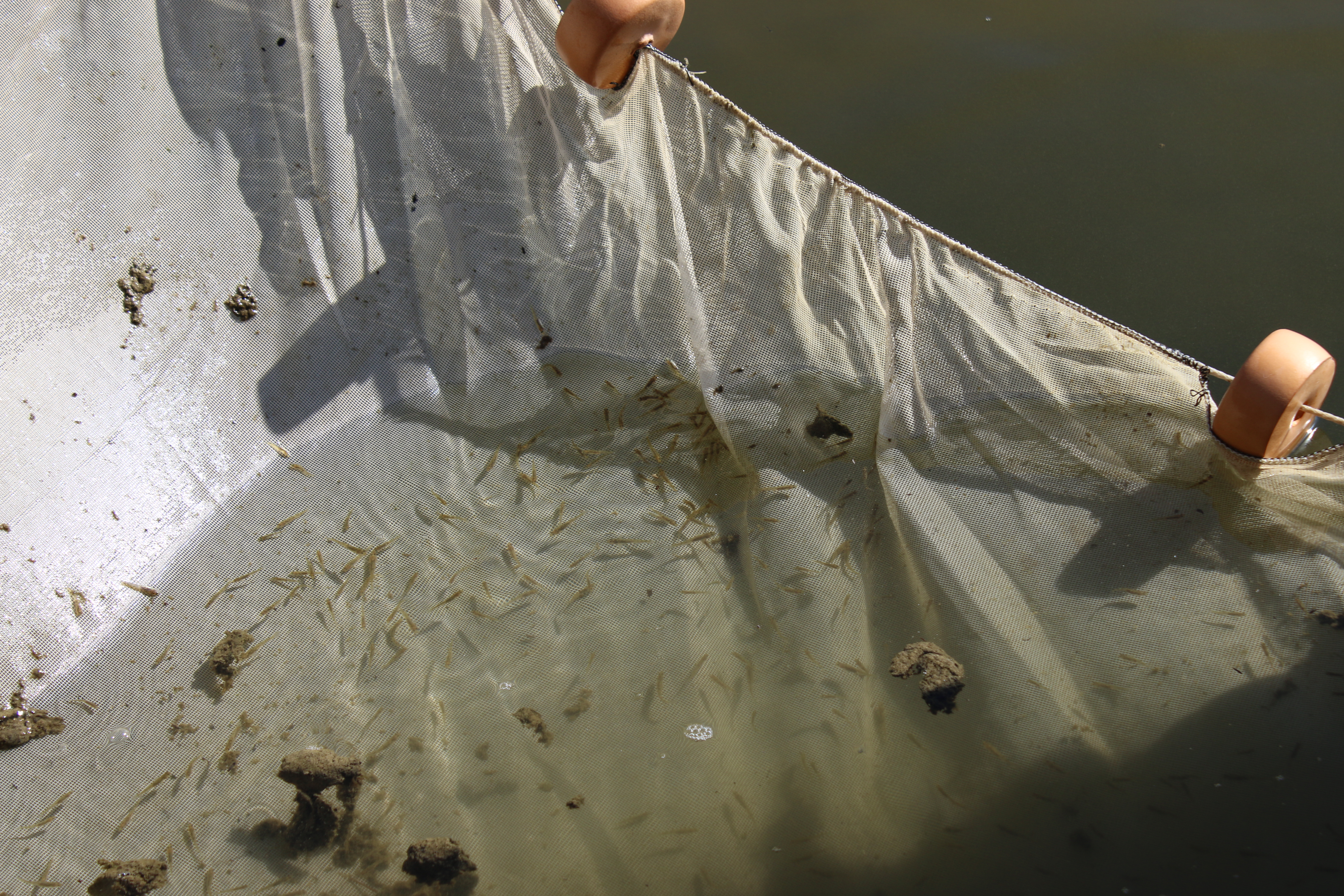 Seine net being pulled with dozens of tidewater gobies. Photo credit: Vanessa Morales/USFWS