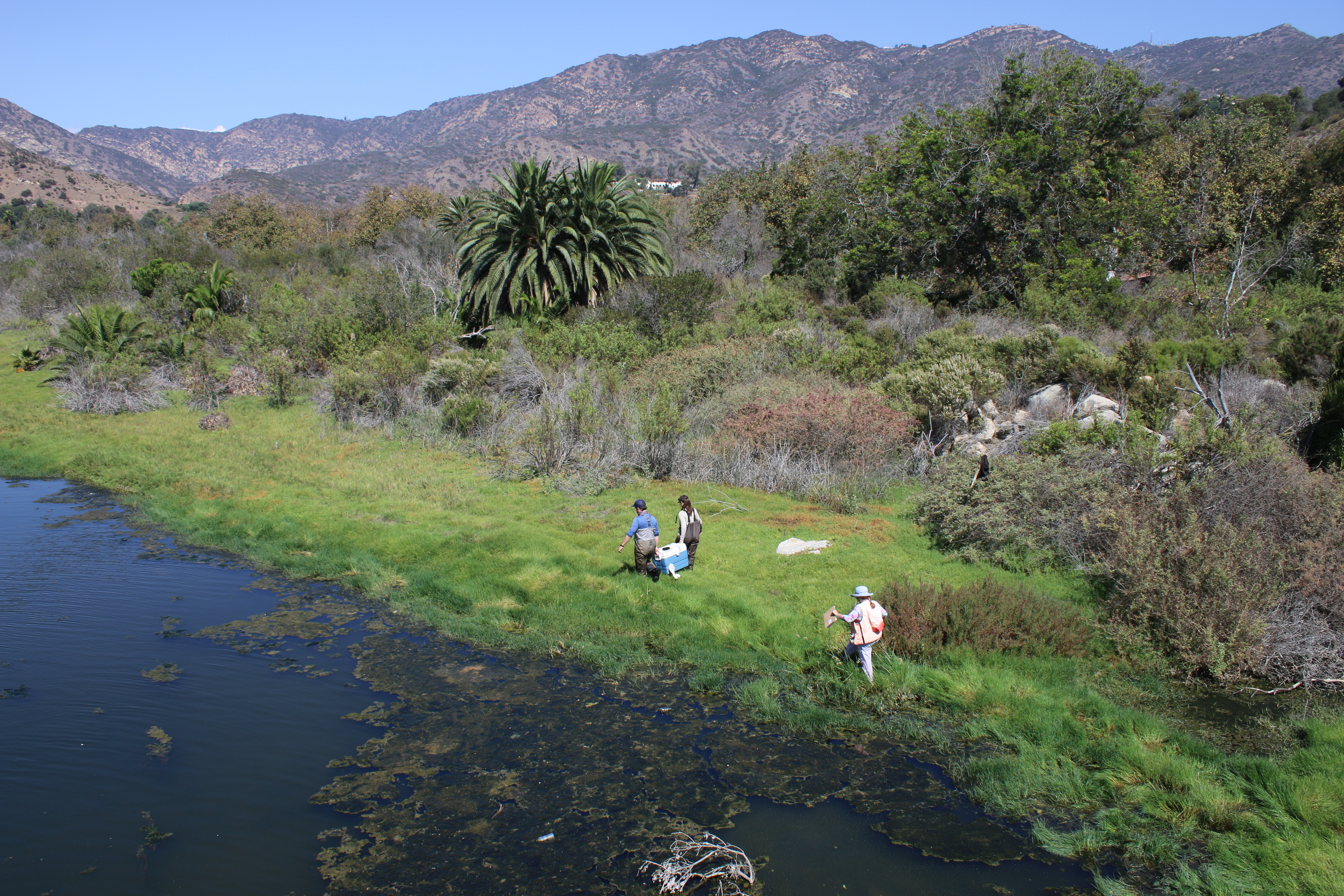 Biologists carry a cooler filled with tidewater gobies to release them into Malibu Lagoon. Photo credit: Vanessa Morales/USFWS