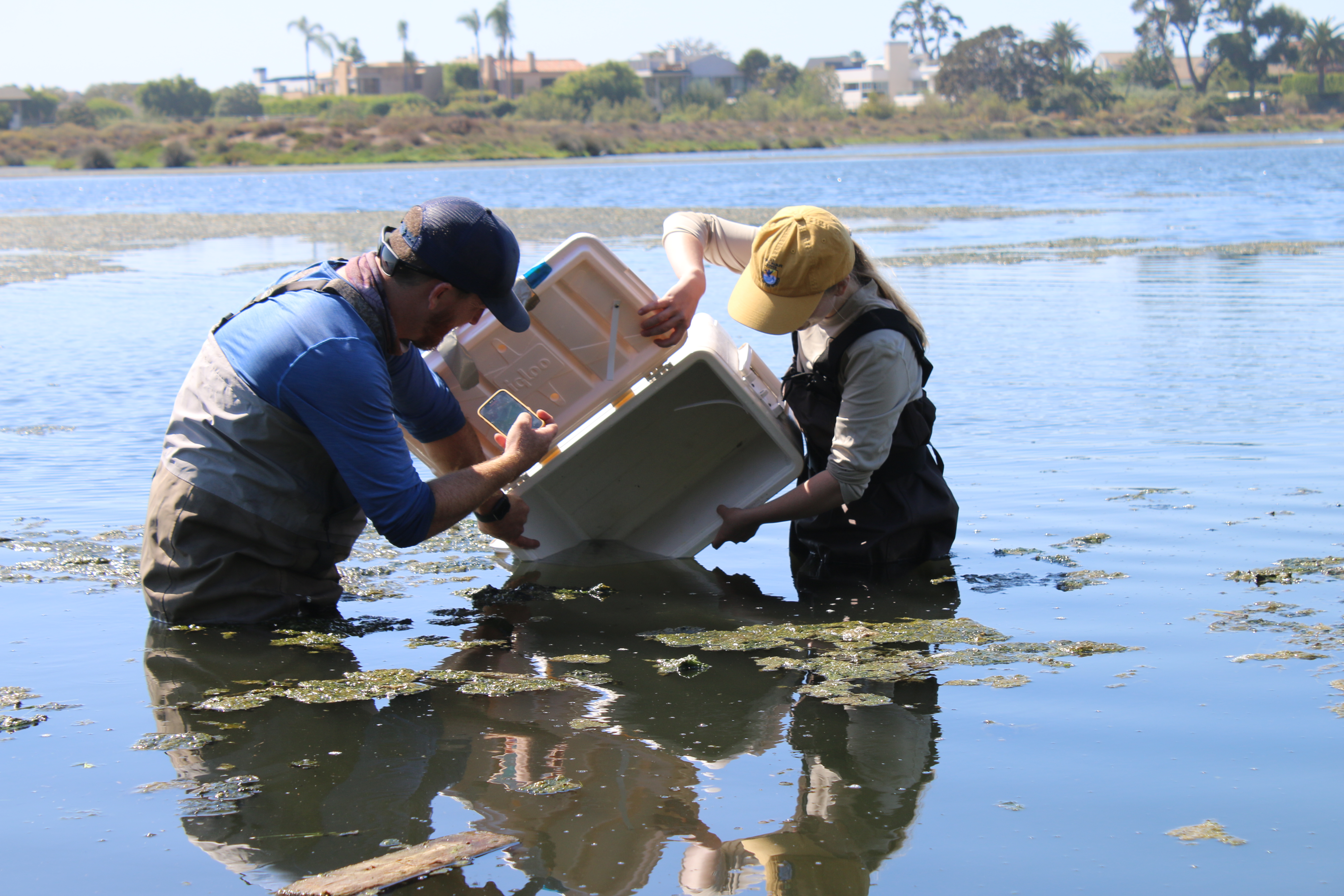 Two biologists pour the contents of the coolers into Malibu Lagoon. Photo credit:Vanessa Morales/USFWS
