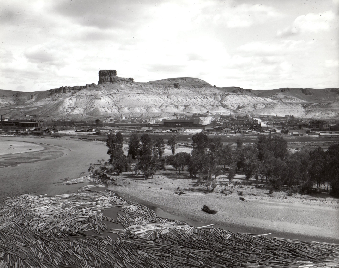 Tie drive on the Green River near Green River, Wyoming. Photographer and exact date unknown. Courtesy of the Sweetwater County Museum. Lumber was floated down rivers as a way to transport logs intended for use as ties on the railroad around the early 1900s and late 1800s.