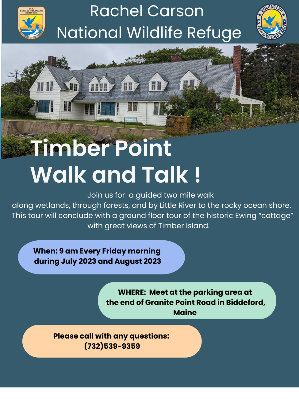 Brochure for guided tours at Timber Point on Fridays at 9 am in July and August. Tours will be begin at the end of Granite Point Road in Biddefore, Maine.