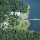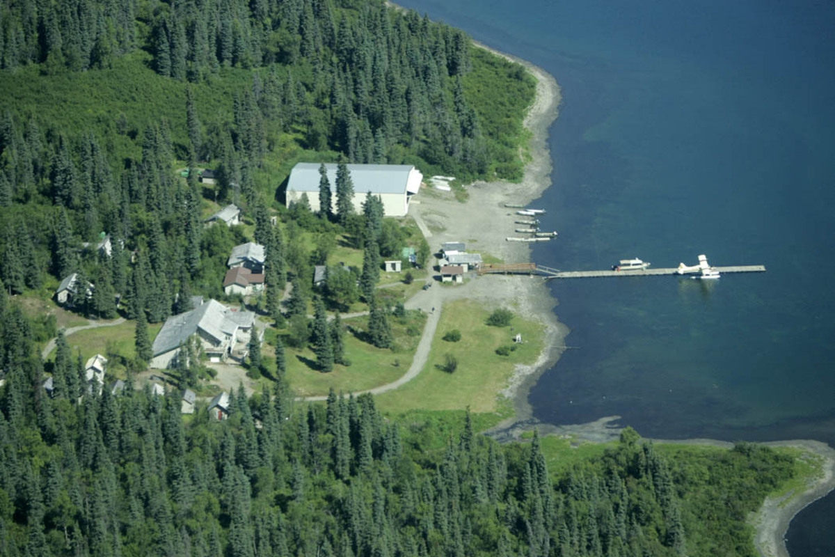 Aerial view of buildings and seaplane launch pad in Togiak National Wildlife Refuge in Alaska.