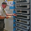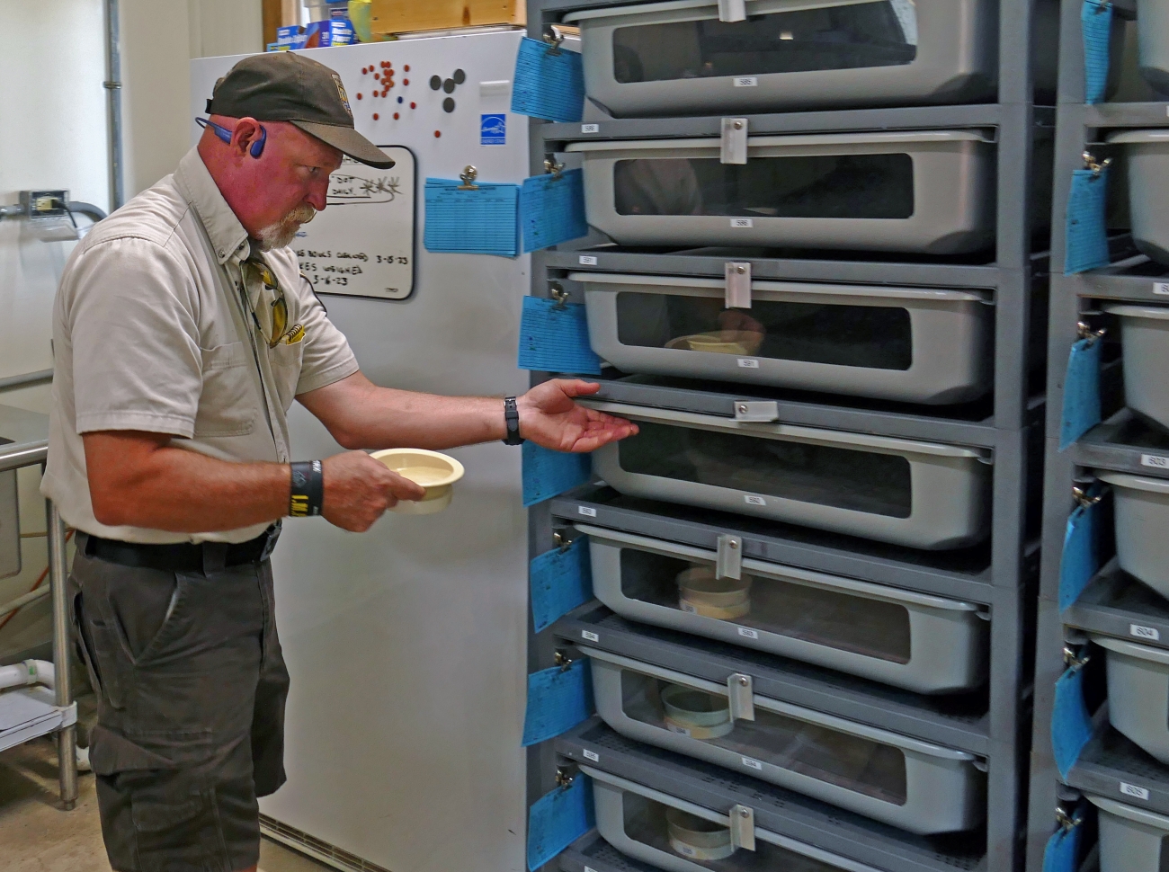 Tony Brady delivers fresh water to one of the eastern indigo snakes housed in stacked trays at the Welaka National Fish Hatchery. Brady is the project leader. The snakes are bred and hatched at Central Florida Zoo’s Orianne Center for Indigo Conservation and the hatchery raises them until they are big enough to survive in the wild.