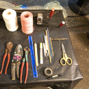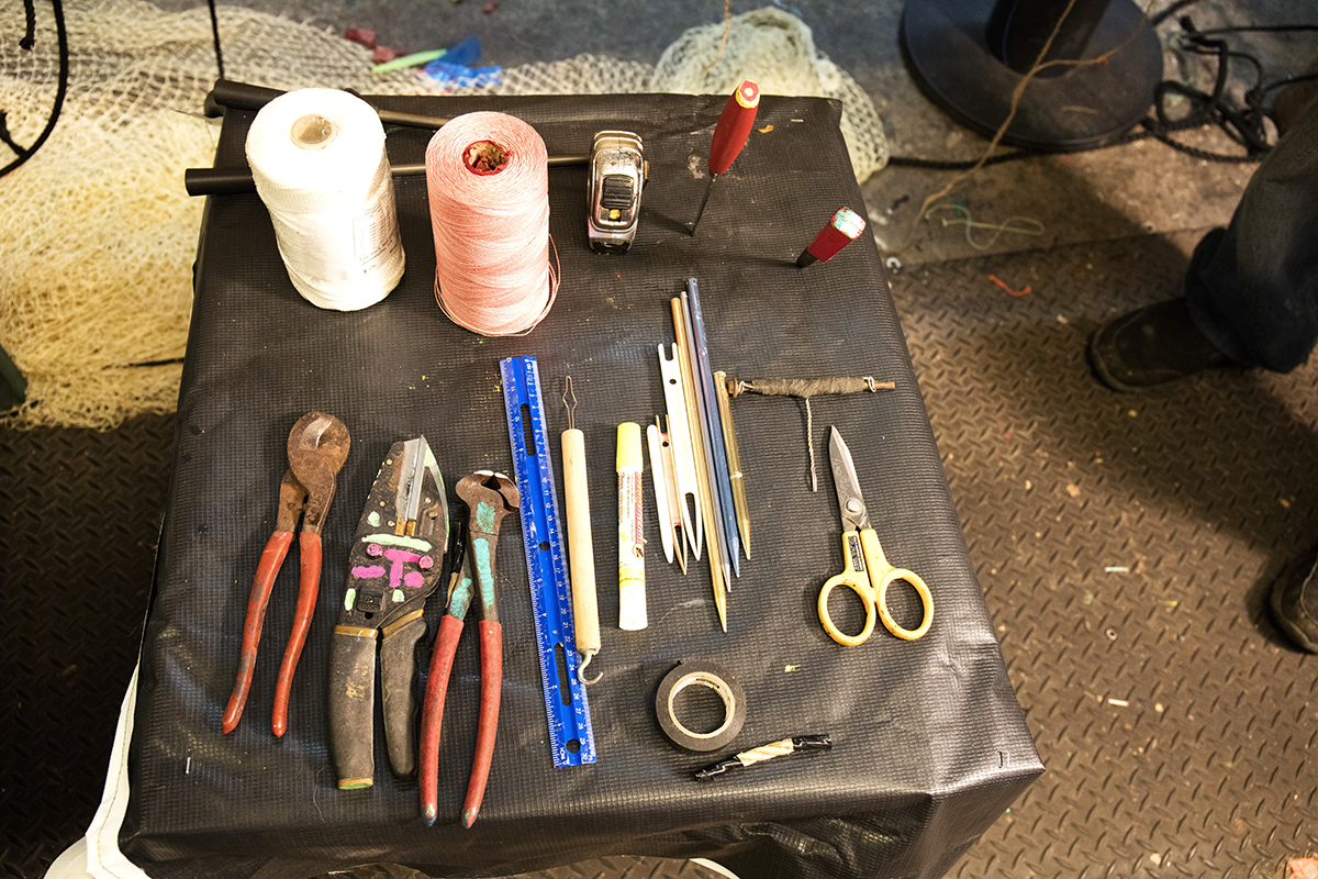 Tools and twine used for net repair.