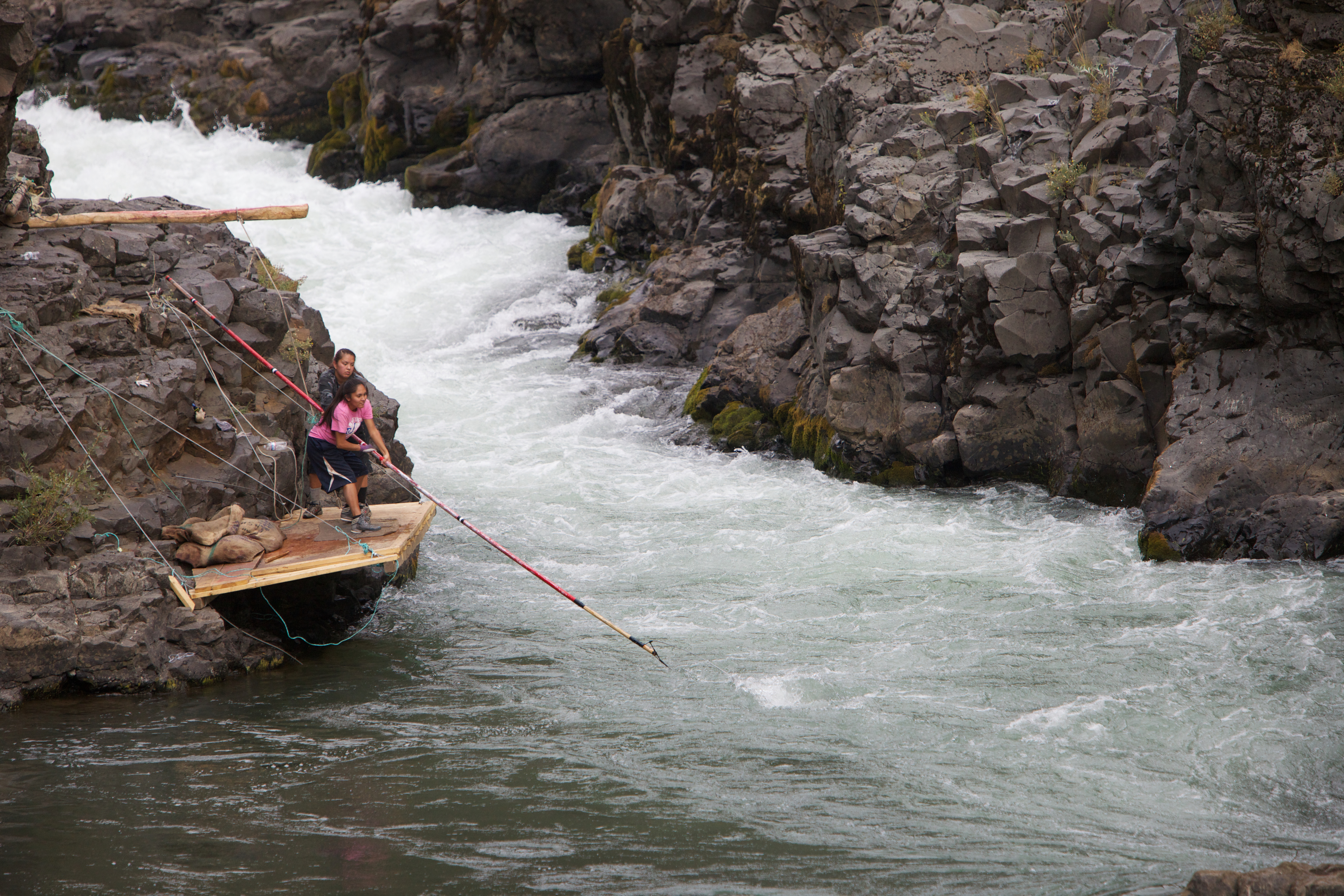 A pair of female Yakama tribal members fish in the Klickitat River for Fall Chinook salmon. Dip nets, traditional fishing, Columbia River Fishery, Hatchery Columbia River Inter-Tribal Fish Commission. Pacific Northwest Fisheries.