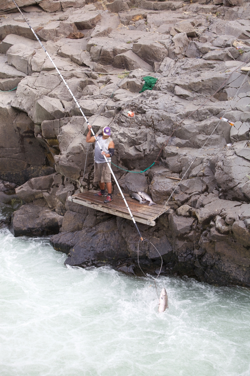Yakama tribal members fish in the Klickitat River for Fall Chinook salmon. Dip nets, traditional fishing, Columbia River Fishery, Hatchery Columbia River Inter-Tribal Fish Commission. Pacific Northwest Fisheries.