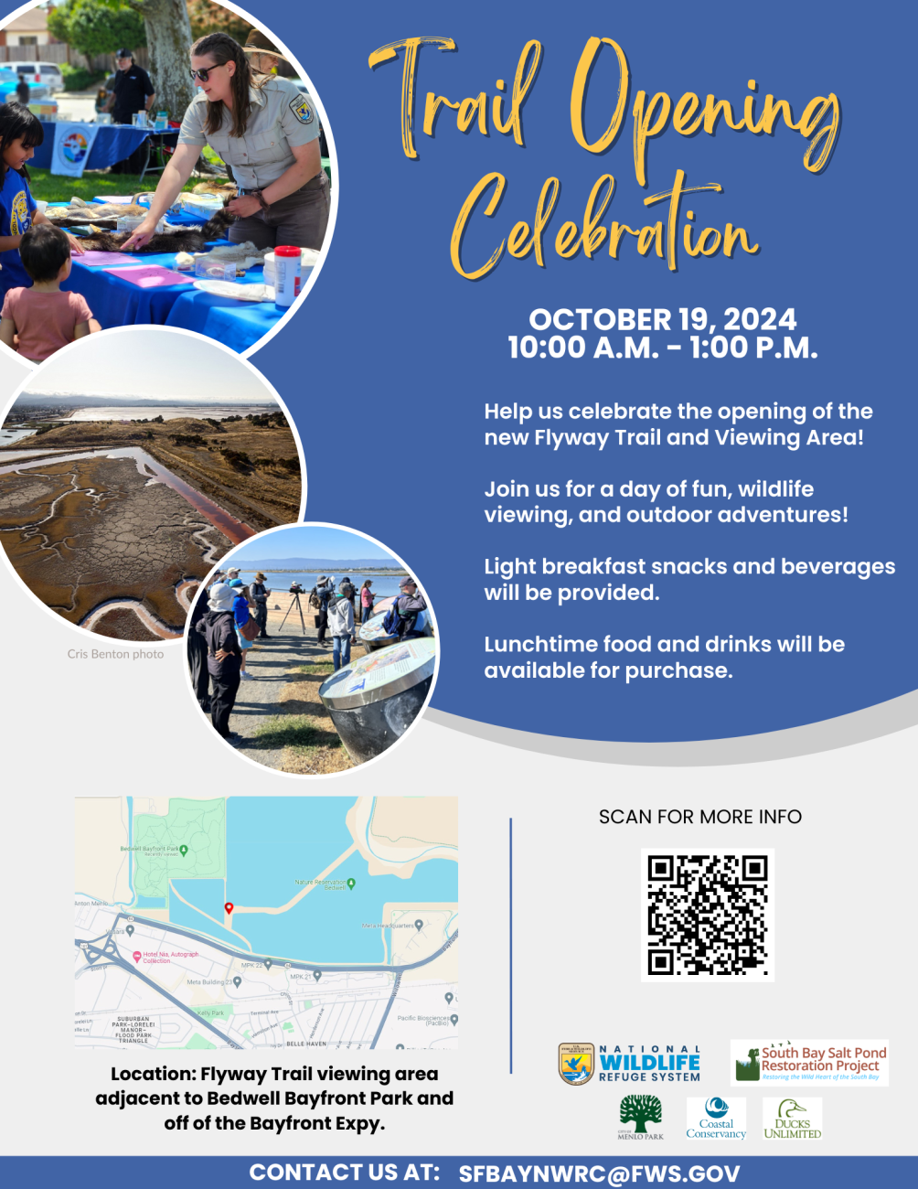 Help us celebrate the opening of the new Flyway Trail and Viewing Area! Join us for a day of fun, wildlife viewing, and outdoor adventures! Don Edwards San Francisco Bay National Wildlife Refuge.