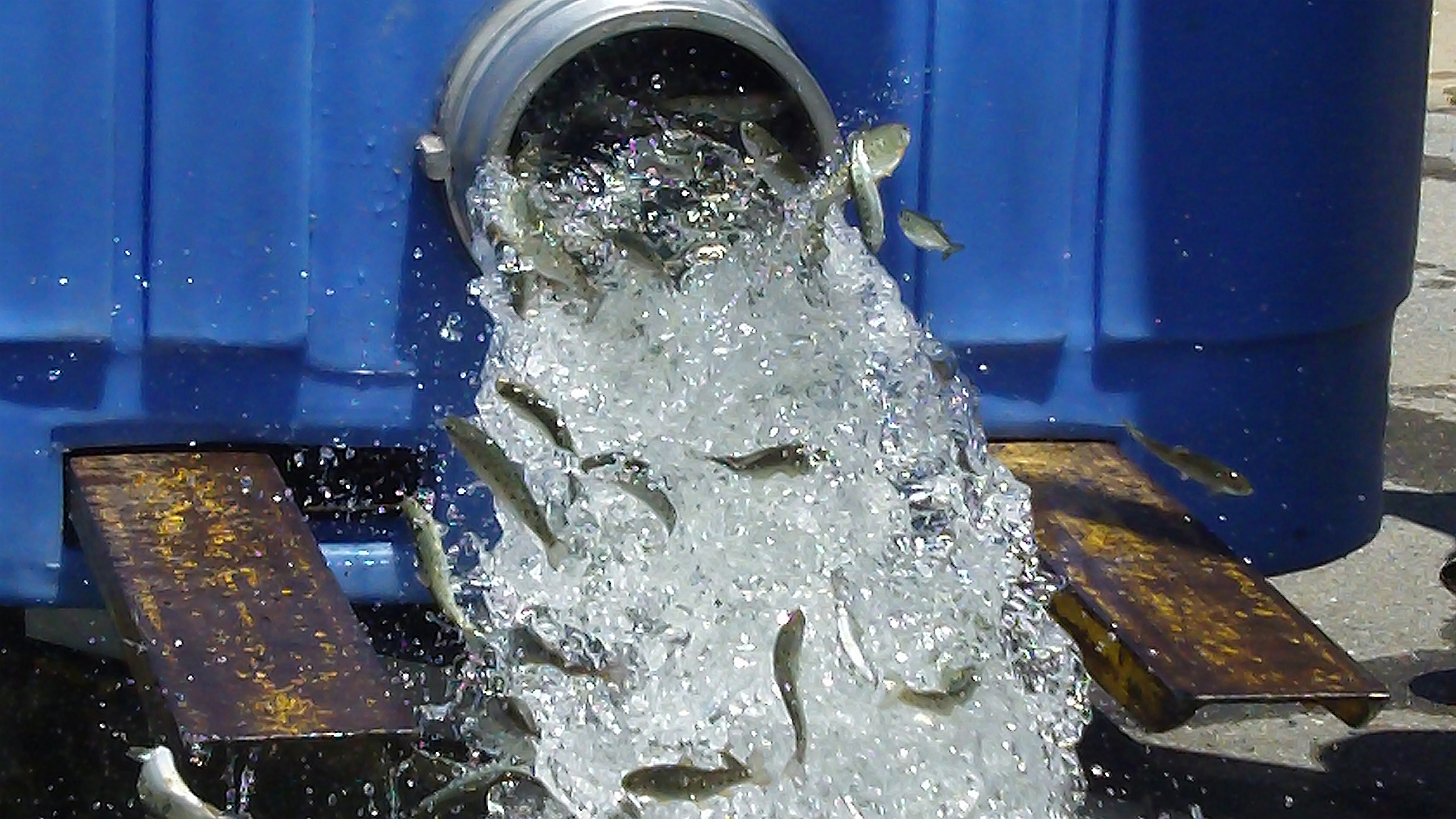 Juvenile rainbow trout from the Northeast Fishery Center in Lamar, PA. flow out of a transport tank into a raceway. Image taken from USFWS Northeast Region Flickr page.