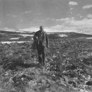 Man carrying caribou calf in gunny sack, across tundra. Alaska;Aleutians;Animals;Caribou Transplant; ARLIS; Alaska; AKHIST336