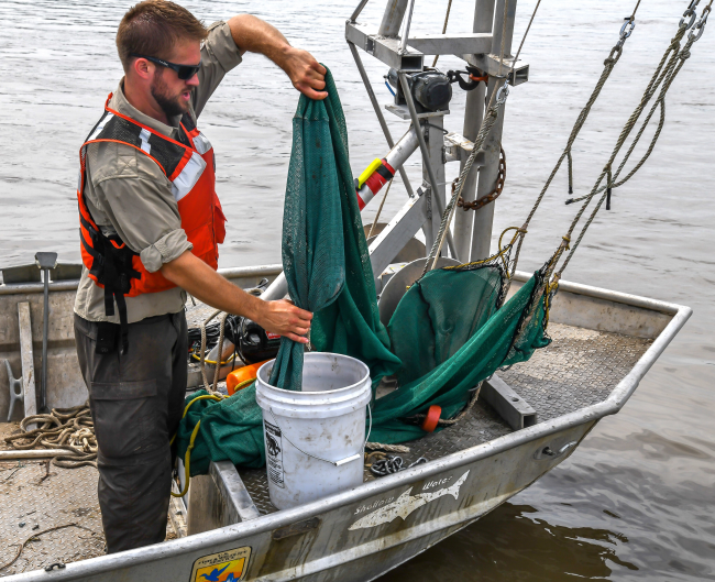 The trawl has been retrieved and the cod end is being emptied into a 5-gallon bucket.