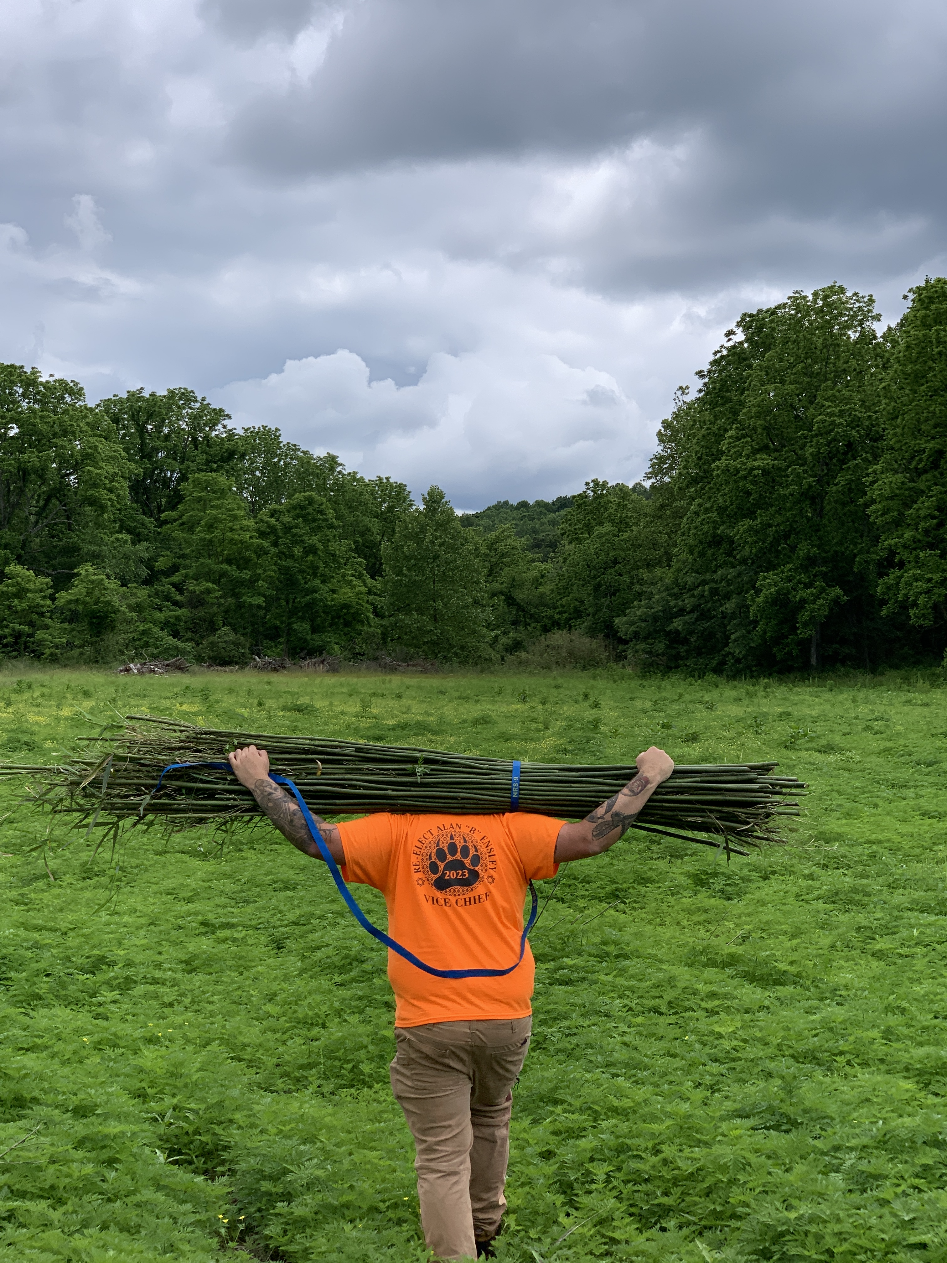 A Tribal artisan carries a bundle of river cane during a harvest trip