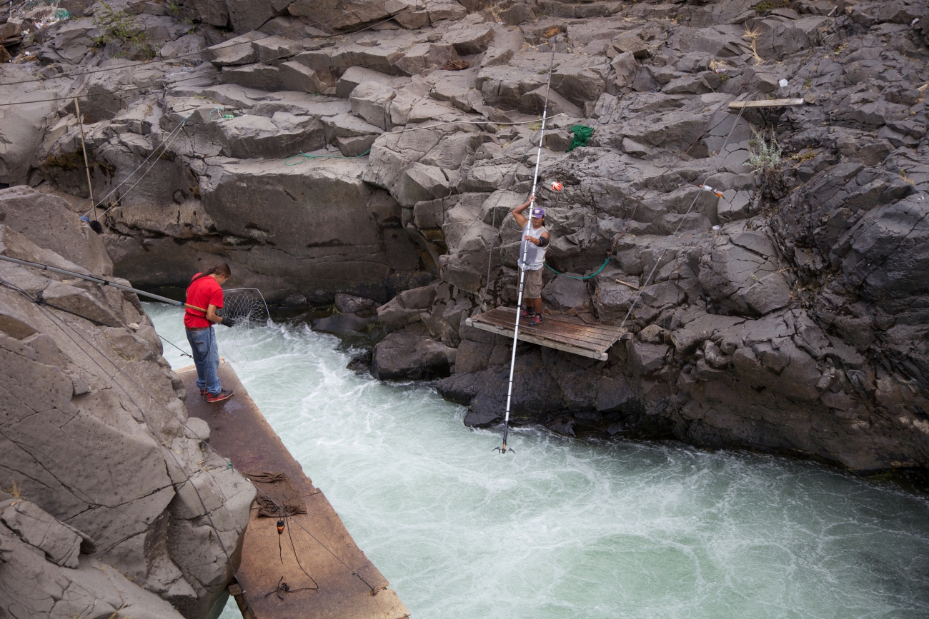 Yakama tribal members fish in the Klickitat River for Fall Chinook salmon. Dip nets, traditional fishing, Columbia River Fishery, Hatchery Columbia River Inter-Tribal Fish Commission. Pacific Northwest Fisheries.