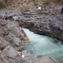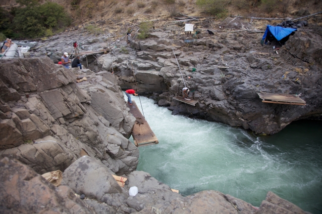 Several Yakama tribal members fish in the Klickitat River for Fall Chinook salmon. Dip nets, traditional fishing, Columbia River Fishery, Hatchery Columbia River Inter-Tribal Fish Commission. Pacific Northwest Fisheries.